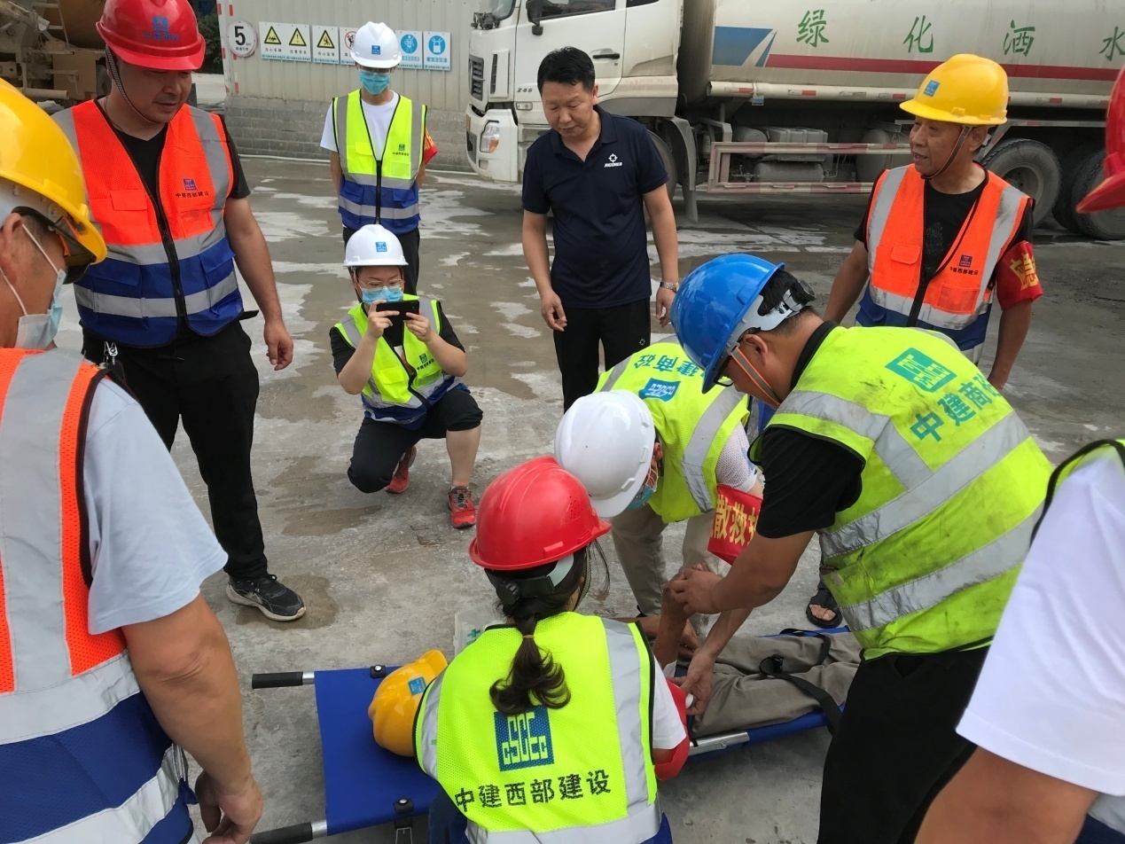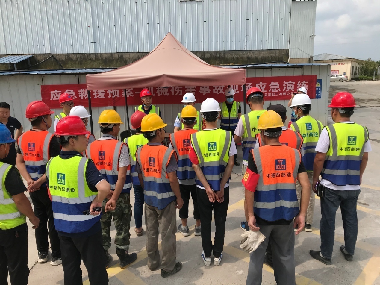 活动现场,成立了应急指挥部、应急救援组、疏散救护组、治安保卫组、后勤保障组、通讯联系组,参加演练65人。事故情景设定为搅拌楼在设备检维修时,发生机械伤害事故。随着事故的发生,各小组人员在应急指挥部的指挥下,按照应急预案开展应急演练,赶赴现场、疏散人员、切断电源、清理现场、救治伤员等,演练过程有条不紊,专业高效,共持续40分钟。