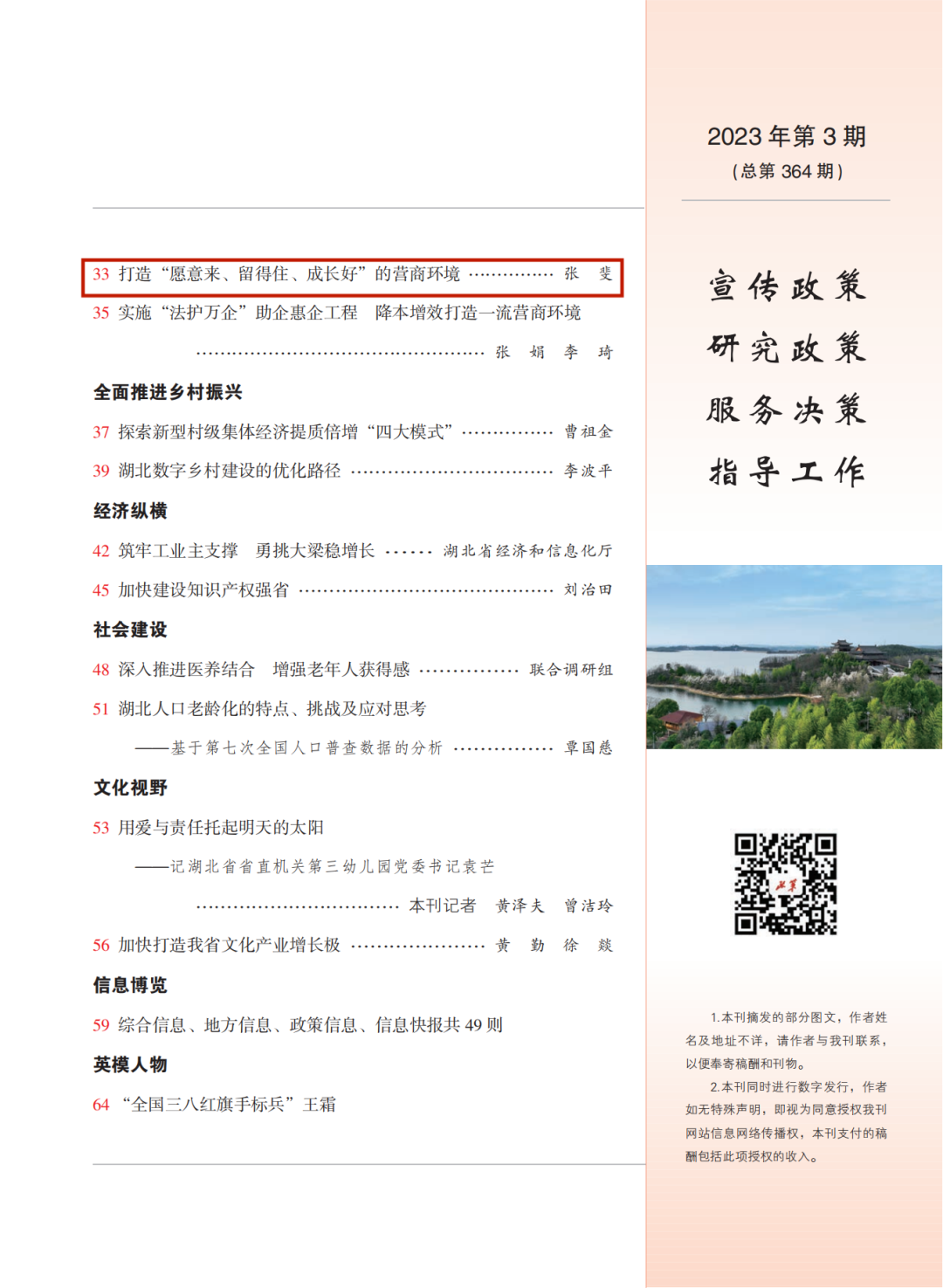 近日,由中共湖北省委主管主办的《政策》杂志2023年第3期,刊发了区委书记张斐署名文章《打造“愿意来、留得住、成长好”的营商环境》。全文如下: