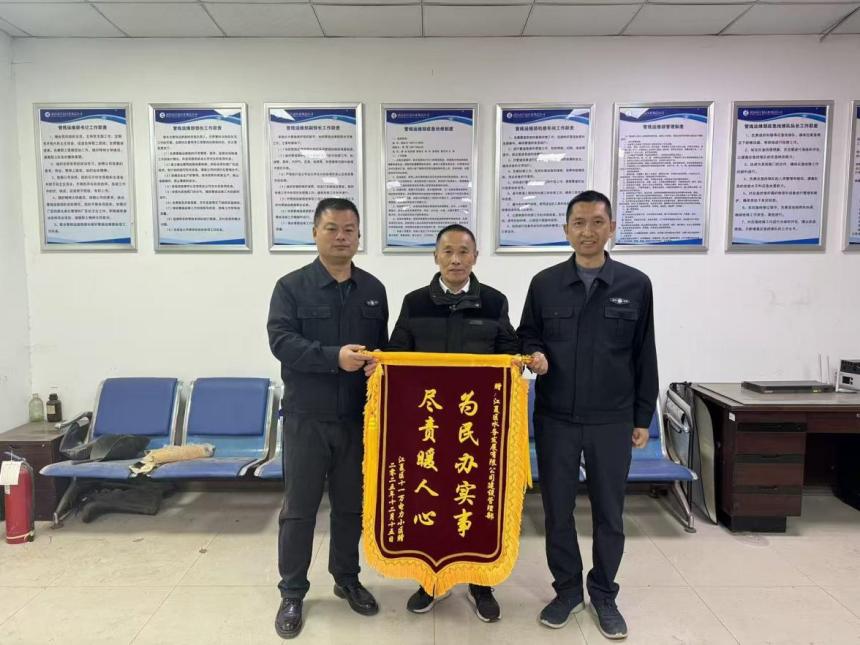 发布日期:2025-12-19 10:19 文章来源:江夏城市资产运营管理有限公司 编辑:张忠强12月16日,十一万电力小区业主代表手持“为民办实事 尽责暖人心”锦旗,专程来到区水务公司建设管理部,向公司高效解决小区高峰供水难题表达诚挚谢意。