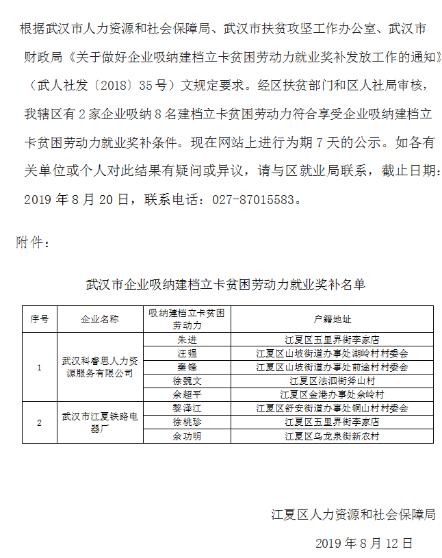 江夏区企业吸纳建档立卡贫困劳动力就业奖补名单公示