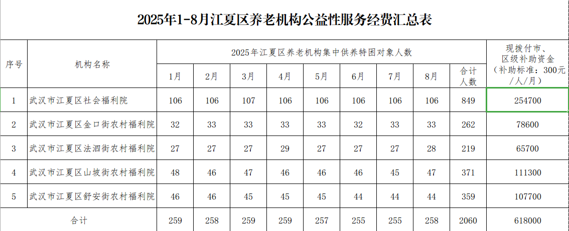 2025年1-8月江夏区养老机构公益性服务经费公开公示