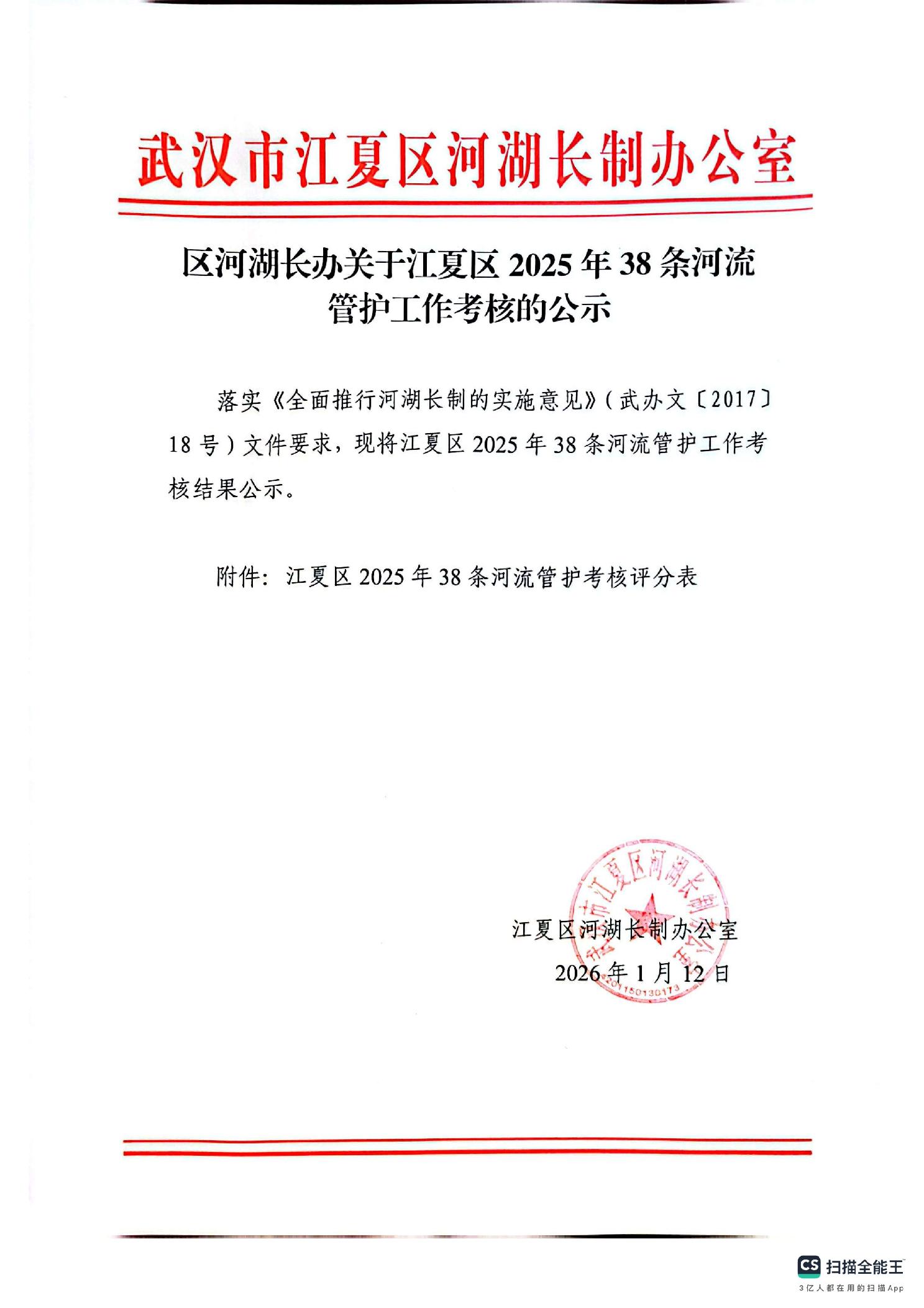 区河湖长办关于江夏区2025年38条河流管护工作考核的公示