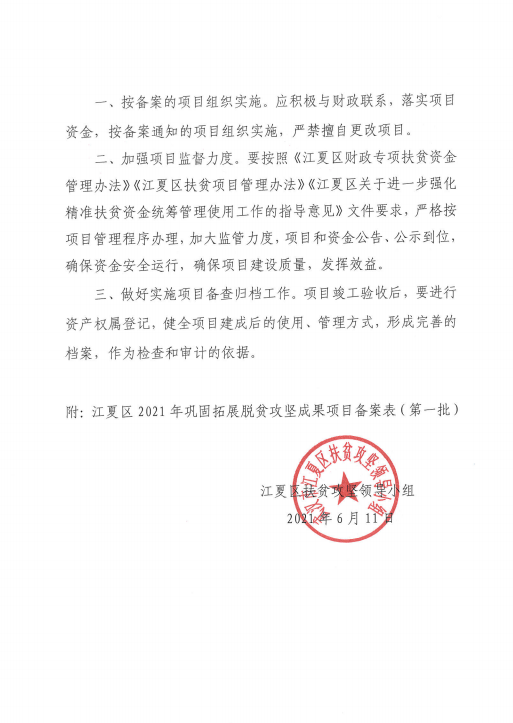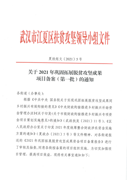 发布日期:2021-06-11 14:45 文章来源:武汉市江夏区扶贫办根据上级有关文件精神,结合各街道报送的《2021年巩固拓展脱贫攻坚成果项目备案报告》,同意各街按上报备案的项目组织实施。为切实加强项目管理,提高项目效益,加强项目监督力度,现将江夏区2021年巩固拓展脱贫攻坚成果项目备案(第一批)进行公示,公示期10天,如有异议请联系区扶贫办。
