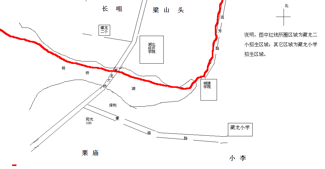 江夏开发区藏龙岛高新技术产业园两所小学划片界线为:杨桥湖以北,流芳路以西为藏龙二小招生范围;其它区域为藏龙小学招生范围。