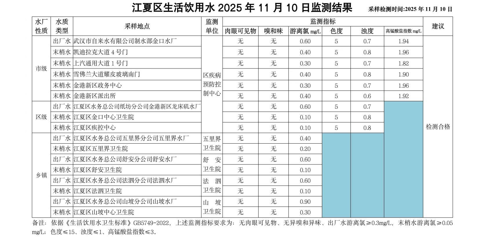 江夏区生活饮用水2025年11月10日监测结果