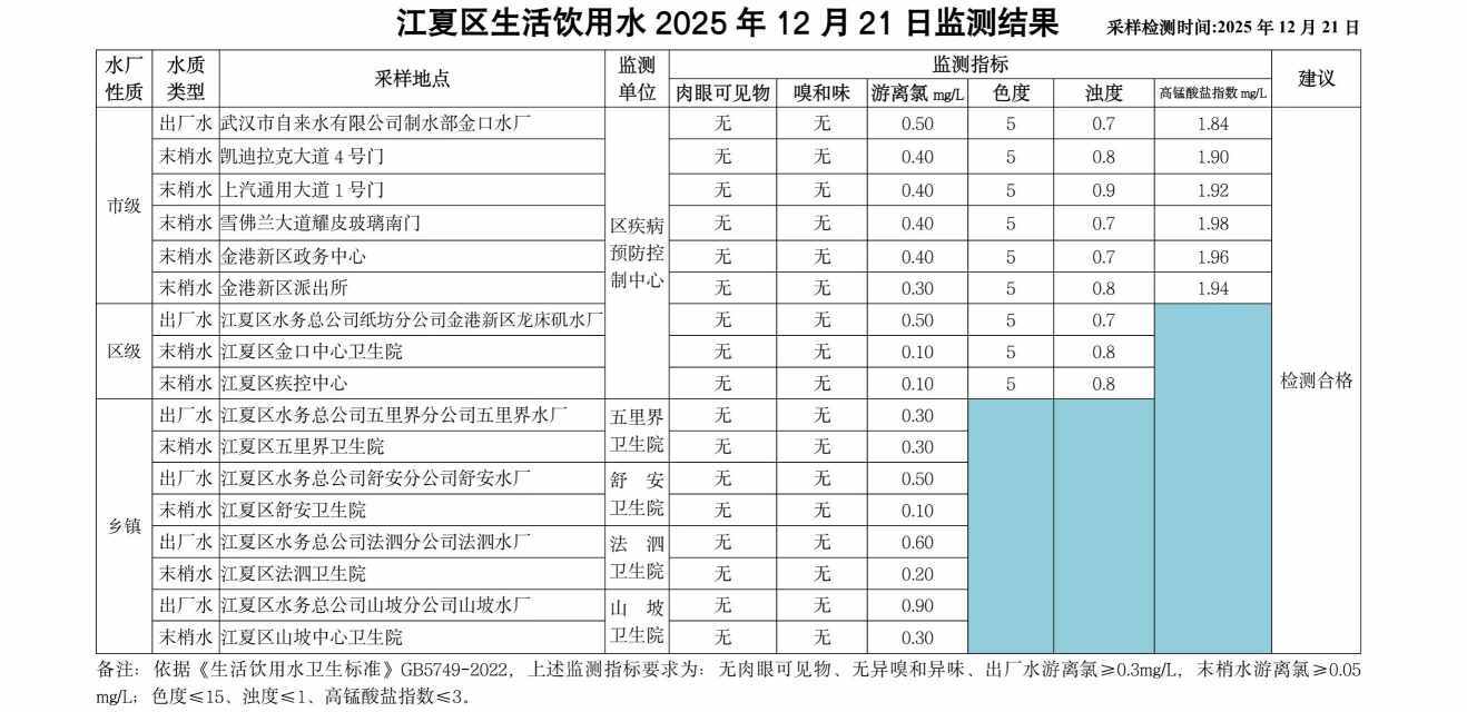 江夏区生活饮用水2025年12月21日监测结果
