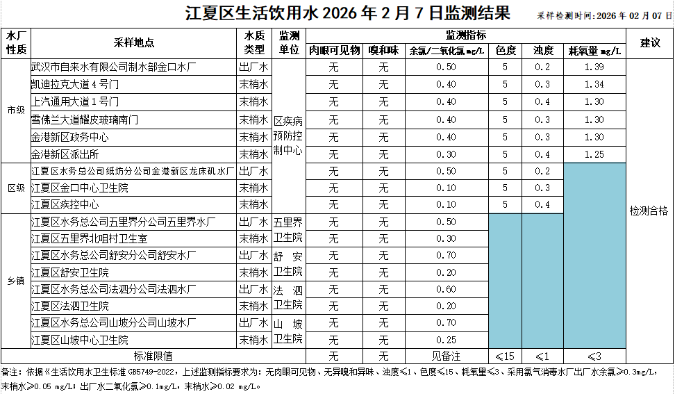 江夏区生活饮用水2026年2月7日监测结果