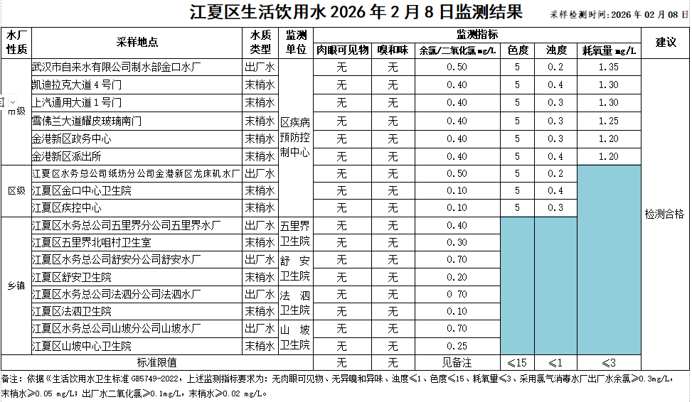 江夏区生活饮用水2026年2月8日监测结果