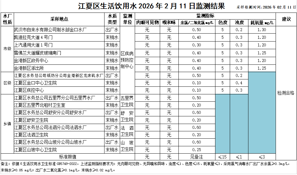 江夏区生活饮用水2026年2月11日监测结果