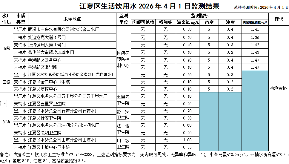 江夏区生活饮用水2026年4月1日监测结果