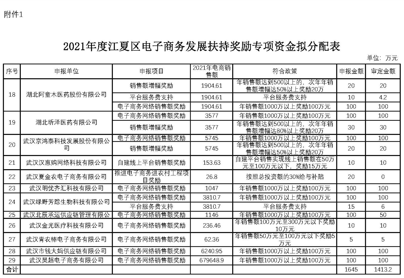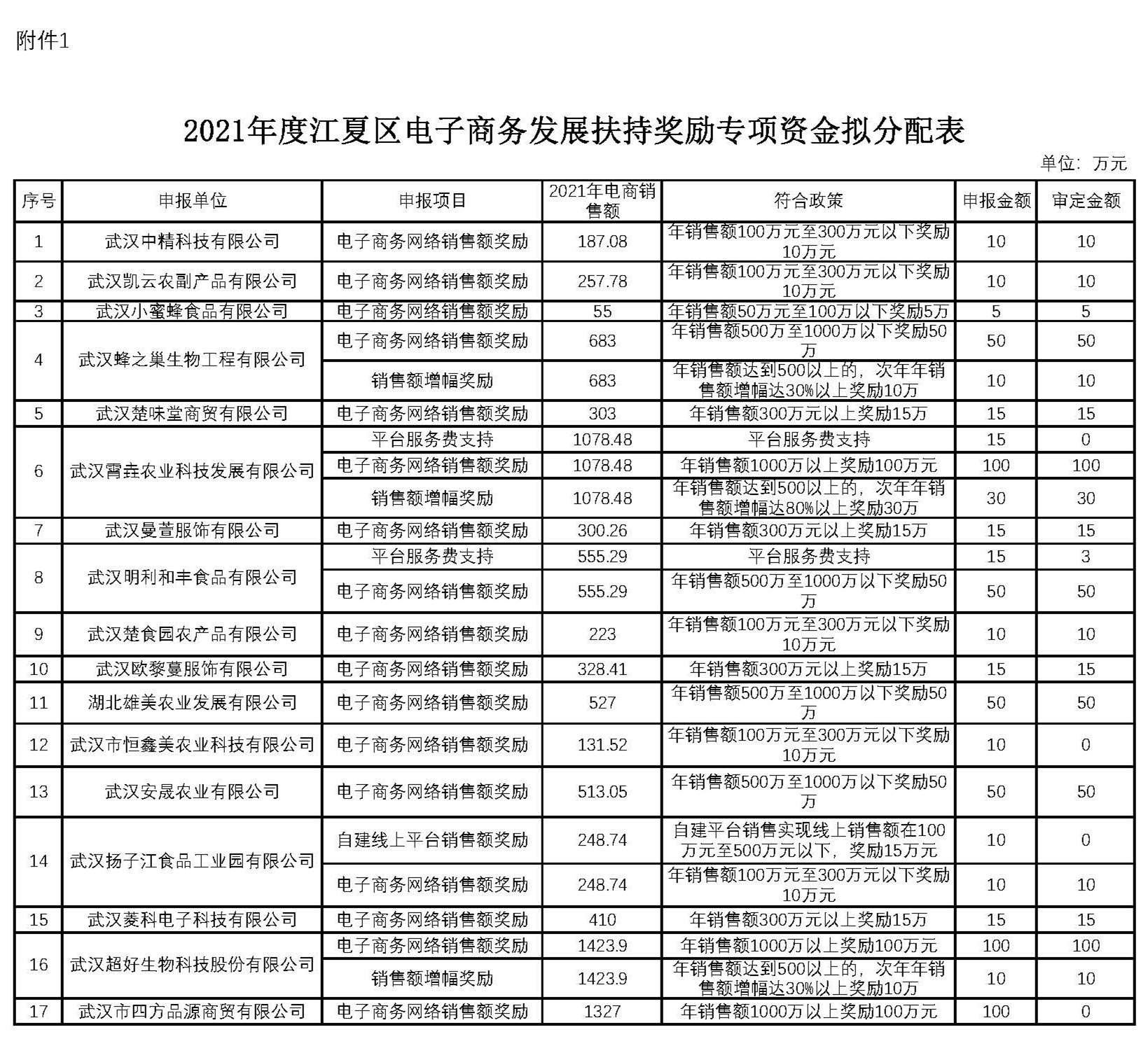 附表:2021年度江夏区电子商务发展扶持奖励专项资金拟分配表
