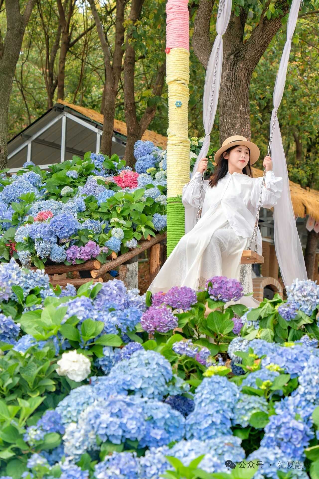 还有超绝氛围感的花海秋千,荡起时,身下裙摆拂动漫山绣球,随手一拍都是治愈系画报……