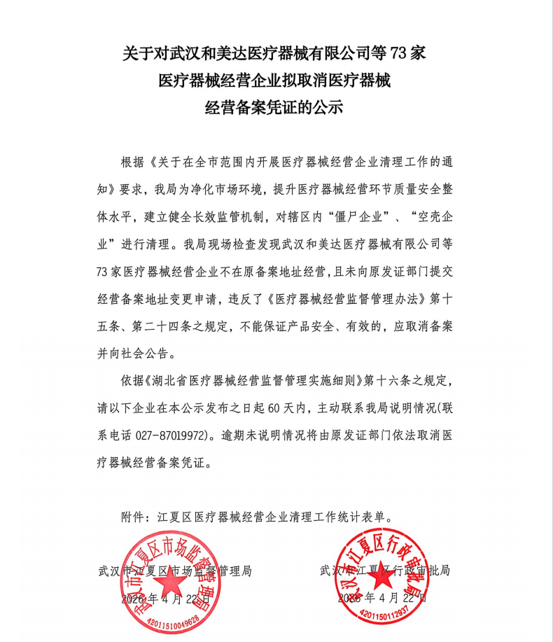 关于对武汉和美达医疗器械有限公司等73家医疗器械经营企业拟取消医疗器械经营备案凭证的公示 来源: 江夏区市场监督管理局 发布时间: 2026.04.22 附件: 江夏区第二类医疗器械经营企业清理工作统计表(73家).xls 相关解读 相关政策 相关文章